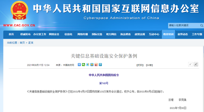中華人民共和國國務院令第745號《關鍵信息基礎設施安全保護條例》已經2021年4月27日國務院第133次常務會議通過,現予公布,自2021年9月1日起施行??偫怼 ±羁藦?021年7月30日關鍵信息基礎設施安全保護條例第一章 總 則第一條 為了保障關鍵信息基礎設施安全,維護網絡安全,根據《中華人民共和國網絡安全法》,制定本條例。第二條 本條例所稱關鍵信息基礎設施,是指公共通信和信息服務、能源、交...